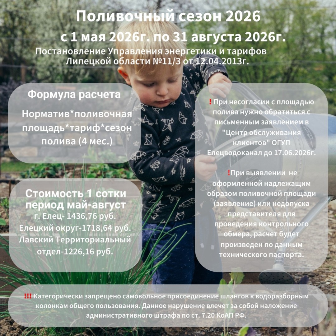 28.04.2026, 11:56Напоминаем, что с 1 мая 2026г. производятся начисления по холодному водоснабжению при использовании земельного участка для полива (согласно Постановлению Управления энергетики и тарифов Липецкой области № 11/3 от 12.04.2013 года).